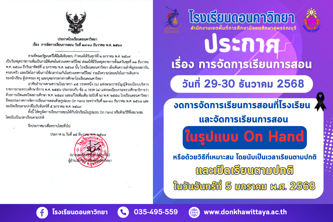 ??ประกาศ เรื่อง การจัดการเรียนการสอน งดการจัดการเรียนการสอนที่โรงเรียน และจัดการเรียนการสอน ในรูปแบบ On Hand ในวันที่ 29-30 ธันวาคม 2568 และเปิดเรียนตามปกติ ในวันจันทร์ที่ 5 มกราคม พ.ศ. 2568