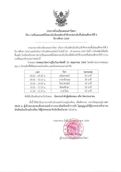 โพสโดยDKSmin ad.donkha@gmail.com                               | ประกาศรายชื่อและเลขที่นั่งสอบนักเรียนสมัครสอบเข้าศึกษาต่อระดับชั้นมัธยมศึกษาปีที่ 4 ปีการศึกษา 2564