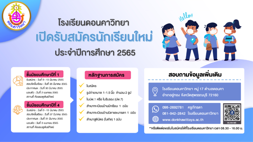 | ประกาศโรงเรียนดอนคาวิทยา เรื่อง การเปิดรับสมัครนักเรียน ประจำปีการศึกษา 2565 |  |